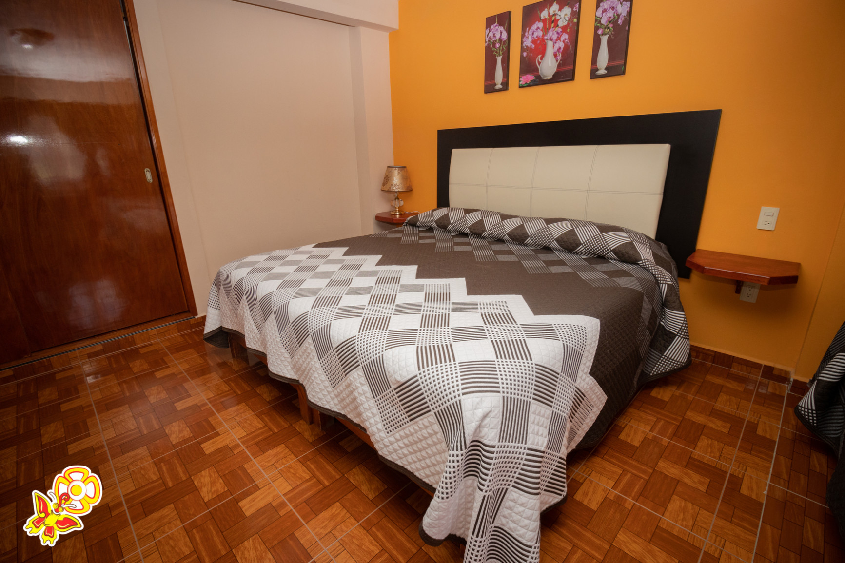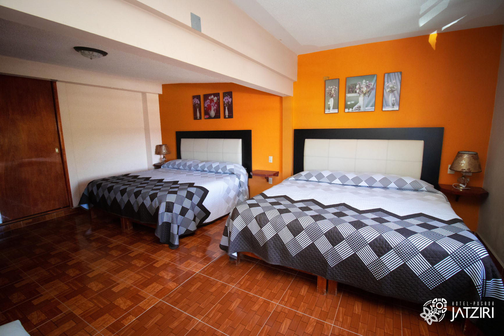Habitación amplia y funcional ideal para alojar cómodamente hasta cuatro personas. Cuenta con dos camas matrimoniales, baño privado con amenidades básicas, televisión, conexión Wi-Fi, agua caliente y mobiliario esencial para una estancia agradable. Es una opción práctica para familias o grupos de viajeros que buscan comodidad y buena relación calidad-precio.